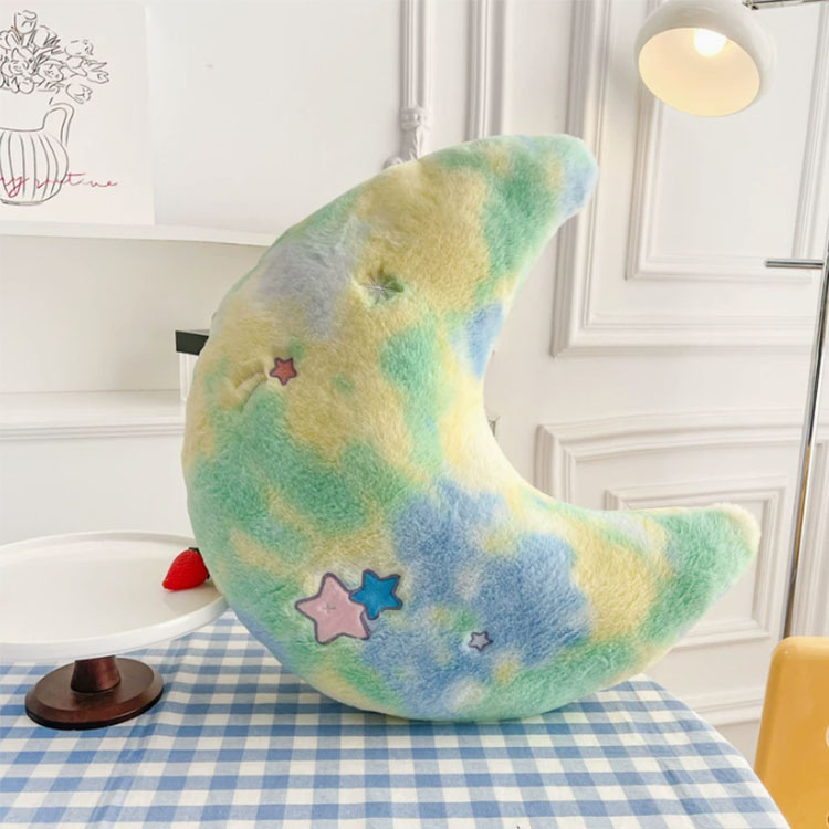 이 달 모양 베개의 가장 큰 특징은 원단이 단색만이 아닌 홀치기염색으로 되어 있다는 점입니다. 예를 들어, 녹색 표면은 노란색과 파란색으로 강조되고, 파란색 표면은 흰색과 보라색으로 강조됩니다. 이것이 정말 눈길을 사로잡습니다.