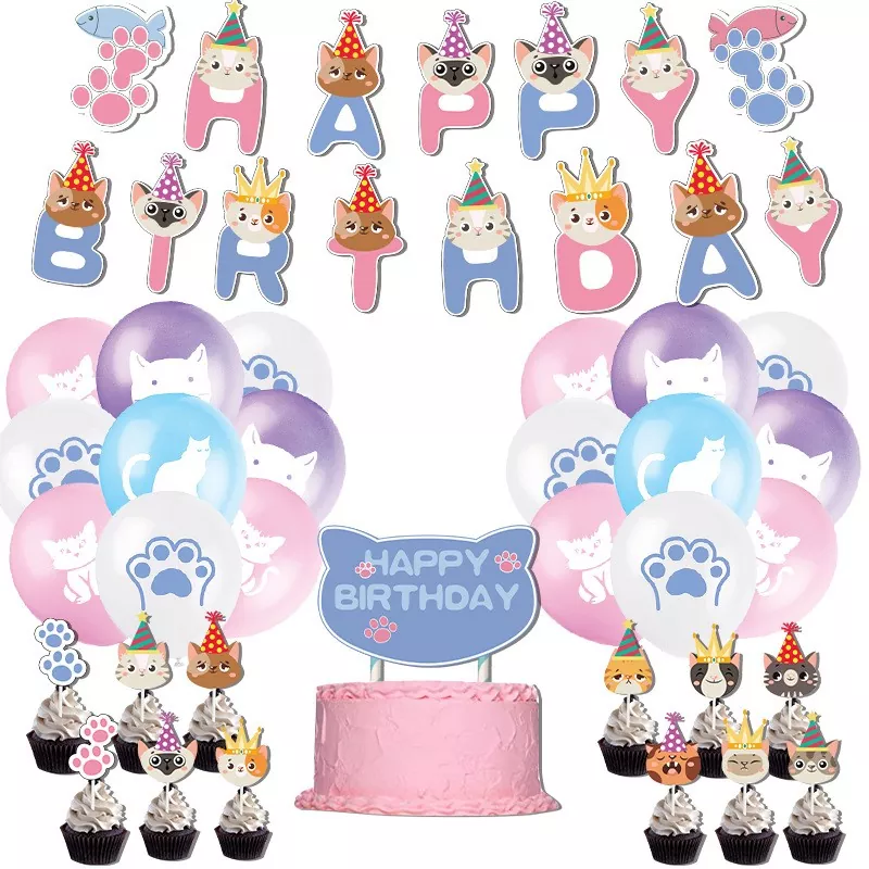 * **웃긴 스타일:** 생일은 따뜻하고 매력적이어야 한다고 누가 말했습니까? "Cat Sneaky" 테마도 있습니다! 장식 그림에는 우스꽝스러운 고양이 이모티콘, "오늘은 내가 왕이다"라고 적힌 배너, "건어물 보존 협회"라고 새겨진 테이블 러너가 있습니다. 이 세트는 손님이 배가 아플 때까지 웃게 만들어 애완동물의 기발한 성격을 완벽하게 포착합니다.