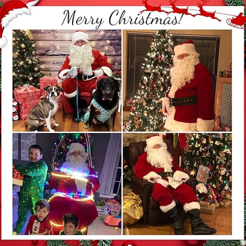 이 산타 클로스 의상은 부드럽고 편안한 폴리 에스테르 직물로 만들어져 겨울 활동 중에는 풍성한 통기성과 따뜻함을 제공하여 따뜻함과 편안함을 보장합니다. 의상의 디자인은 푹신한 흰색 헴과 검은 색 벨트로 강조된 고전적인 빨간색과 흰색 구성표를 유지하여 복잡한 세부 사항에 놀라운 시각적 영향을 미칩니다. 의상에는 모자와 수염이 어울리므로 추가 액세서리없이 쉽게 착용 할 수 있습니다.
